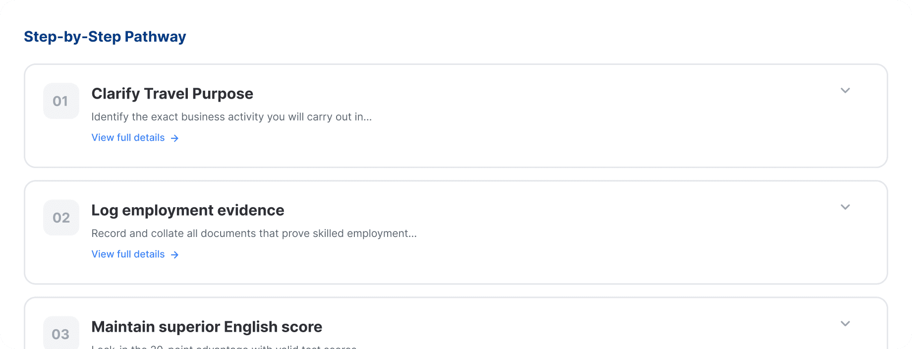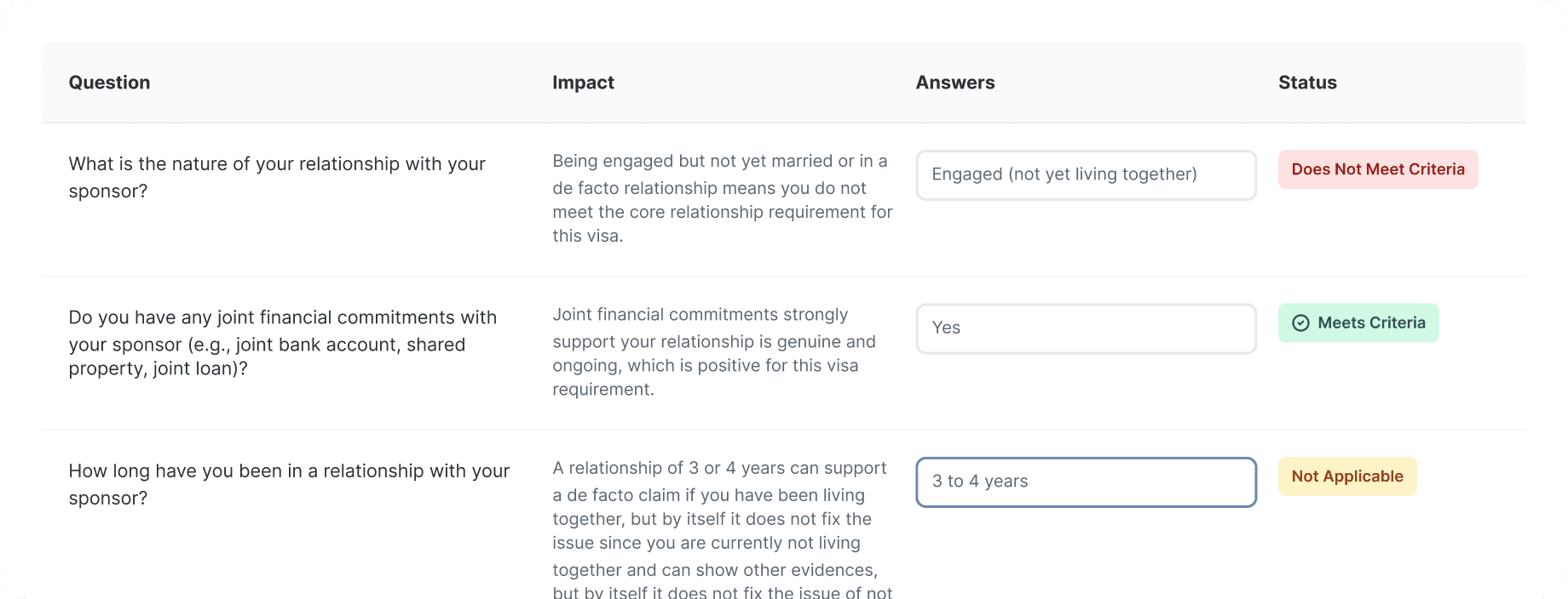 Understand how eligibility criteria and points are assessed, with transparent explanations of where you meet requirements and where gaps exist.